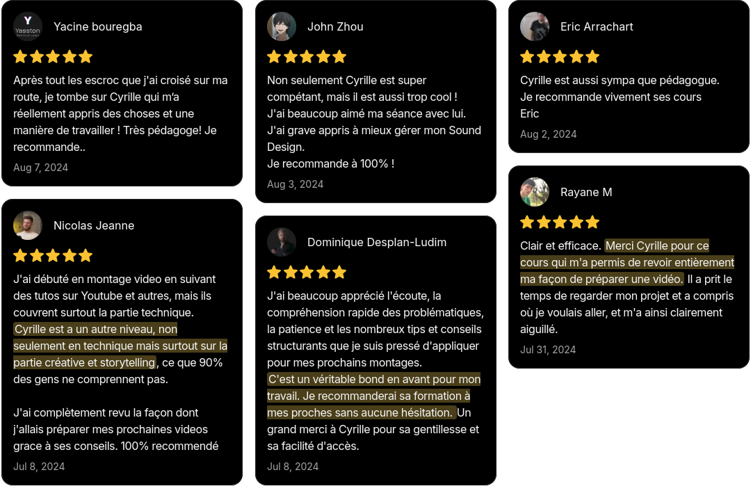 Quel que soit le logiciel je te transmettrais mes meilleurs techniques jusqu'à ce que tu atteignes ton plein potentiel. En mettant la maitrise du montage narratif au centre de ton apprentissage.